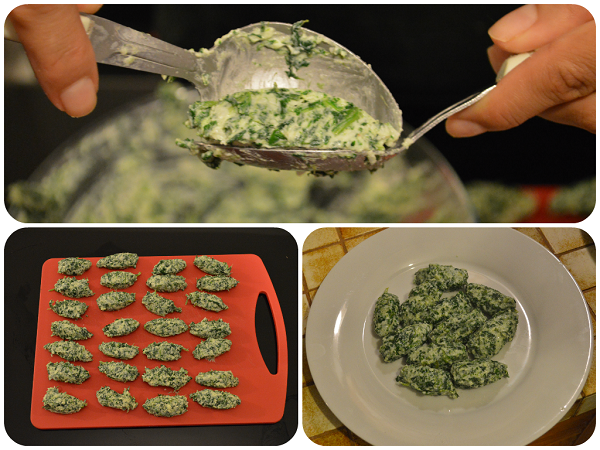 Primero lavar bien la espinaca y hervirla por 2 o 3 minutos máximo, en agua con sal, escurrir bien y picar. Luego simplemente hay que mezclar todos los ingredientes hasta formar una masa blanda pero fácil de moldear.