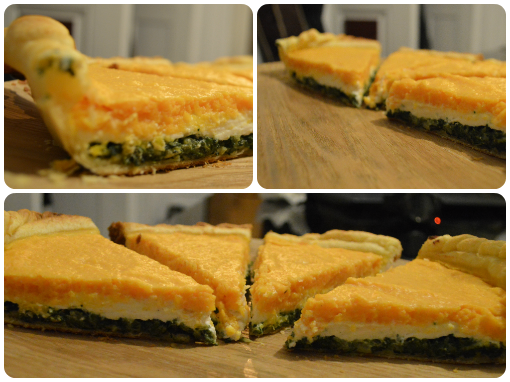 Colocamos la masa en un molde para tarta, en primer lugar ponemos la capa del relleno de acelga, luego la capa de ricota y finalmente la de puré de calabaza y llevamos al horno fuerte por 20 minutos aproximadamente.